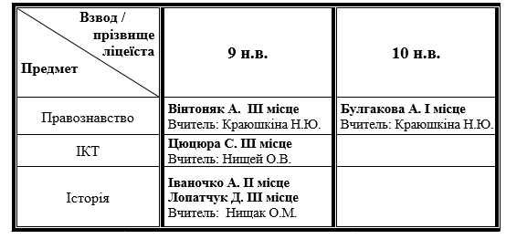Підведено підсумки І етапу Всеукраїнських учнівських олімпіад. Вітаємо переможців та їх наставників і бажаємо й надалі гідно представляти рідний ліцей. Упевненості вам у подальших конкурсних випробуваннях!